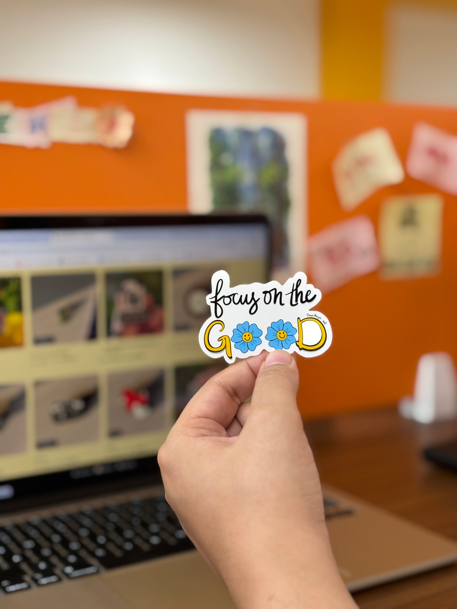 Brighten up your day with the playful "Focus On The Good" sticker! Adorned with cheerful flowers woven into the text, it’s a delightful reminder to keep those positive vibes blooming wherever you stick it.