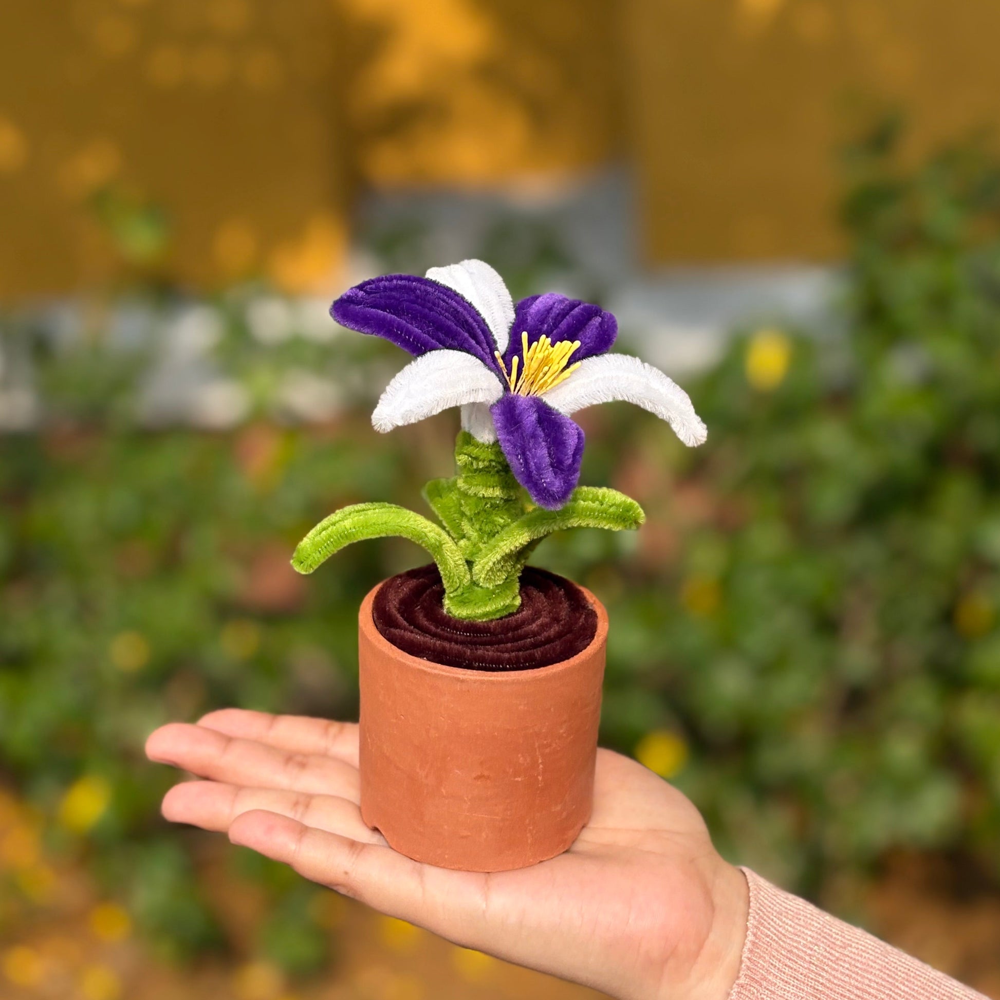 Handmade pipe cleaner flowers in purple and white—a whimsical craft creation that brings cheerful charm to any space. Perfect for DIY enthusiasts, kids' projects, or anyone who loves quirky, colorful décor. Each flower is crafted with fuzzy pipe cleaners twisted and shaped into delightful blooms that won't wilt. Display them in a vase, use as gift toppers, or let your imagination run wild. A playful reminder that the best things don't always need to exist—they just need to be made!