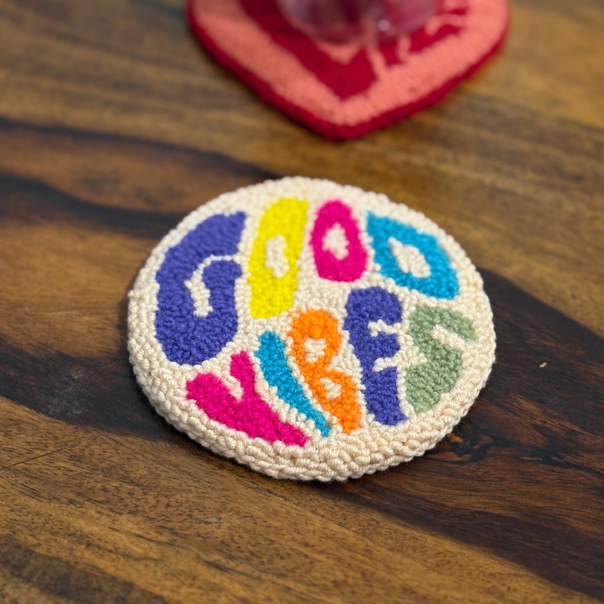Bring a splash of personality to your space with this hand-crafted punch needle coaster that's equal parts functional and fabulous. Crafted with premium quality yarn in vibrant, funky hues, "Good Vibes" doubles as a quirky art piece that sparks conversation. Perfect for protecting your surfaces while adding a playful pop of color to any room. Each coaster is uniquely made, making it a one-of-a-kind addition to your home décor.