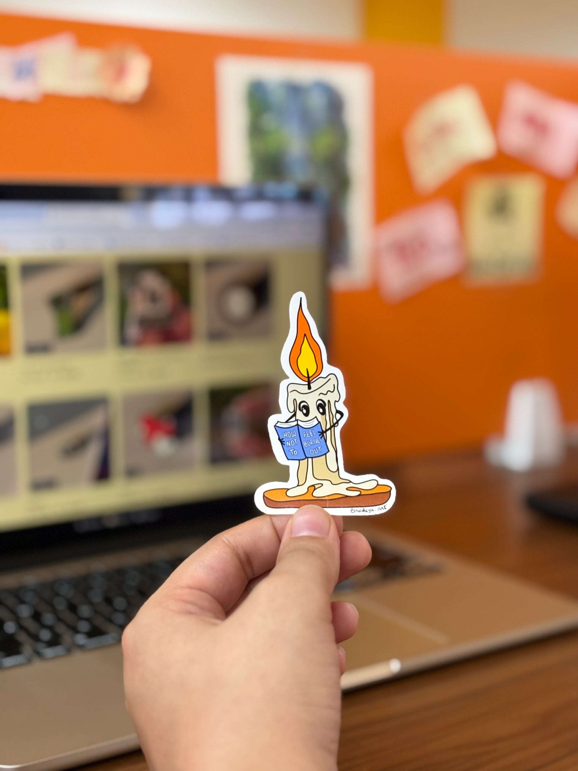 Light up your day with the playful "Candle" sticker! This quirky design shows a candle cozying up with a book titled "How Not To Feel Burned Out," reminding you to take a break and recharge with a smile. Perfect for adding a fun, self-care vibe to your favorite things!