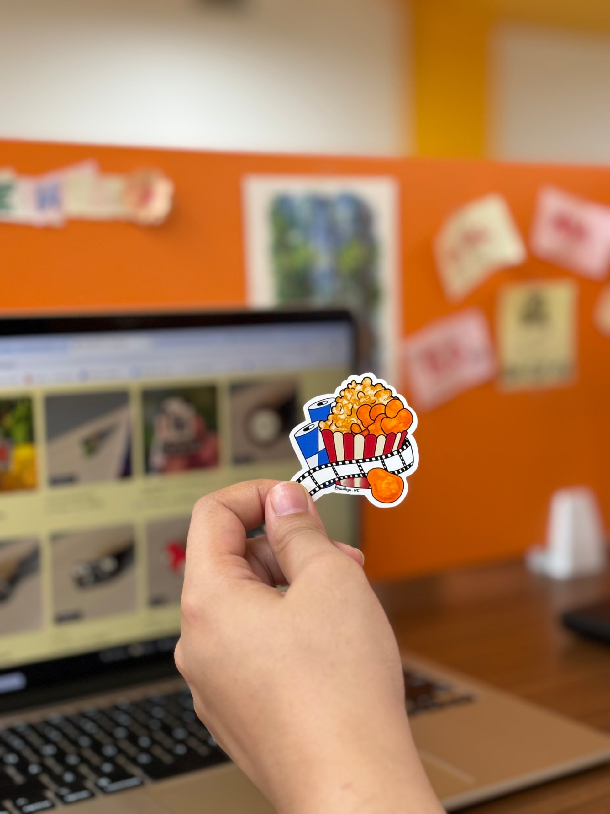 Bring the ultimate snack squad to your stuff with the "Movie Time" sticker! Featuring crunchy chips, buttery popcorn, and a fizzy cold drink, this playful design turns any surface into a mini celebration of your favorite movie munchies. Stick it, snack it, and enjoy the show!