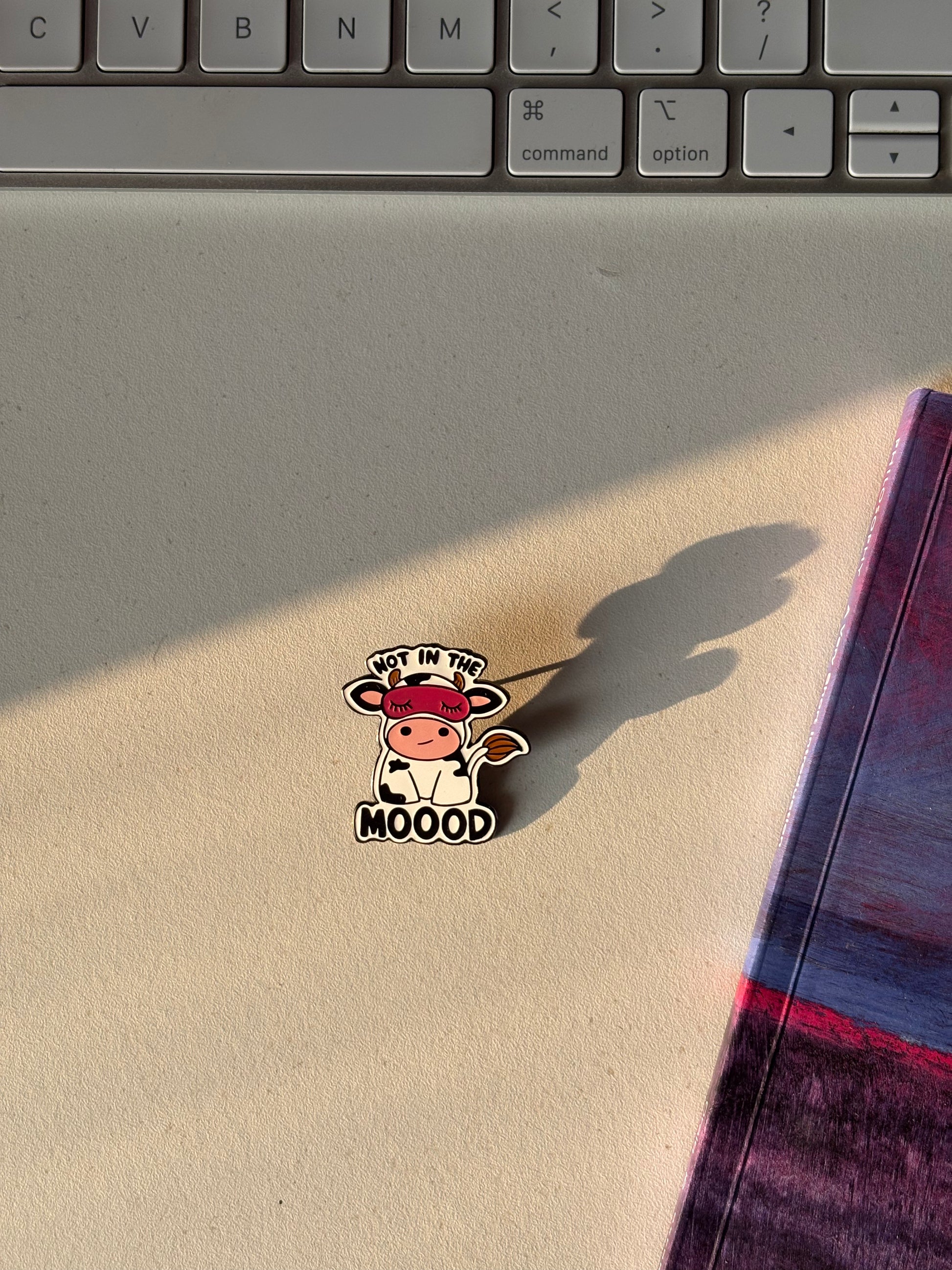 Take a chill break with this playful "Not In The Moood" enamel pin featuring a relaxed cow rocking a sleeping eye mask. Perfect for those days when you just want to moo-ve at your own pace, this pin adds a fun, lighthearted vibe to any outfit or accessory. Wear it and let everyone know you’re savoring some well-deserved downtime!
