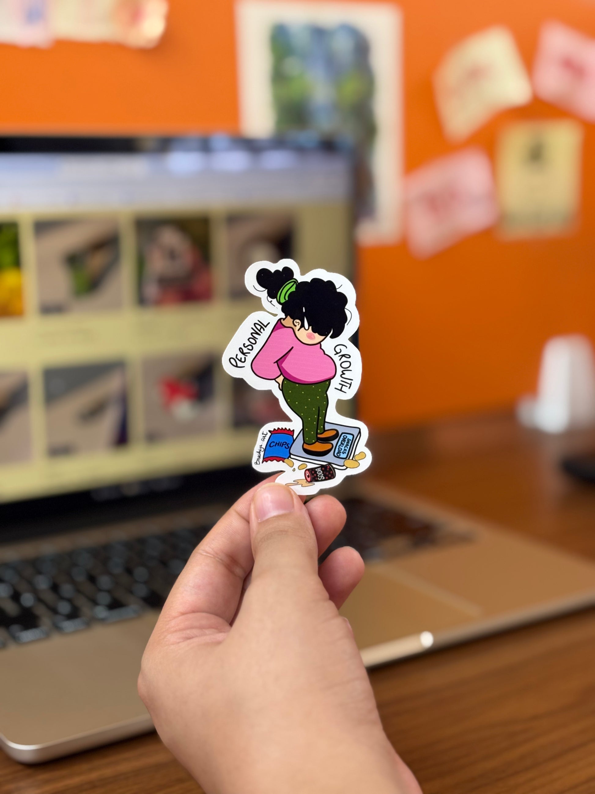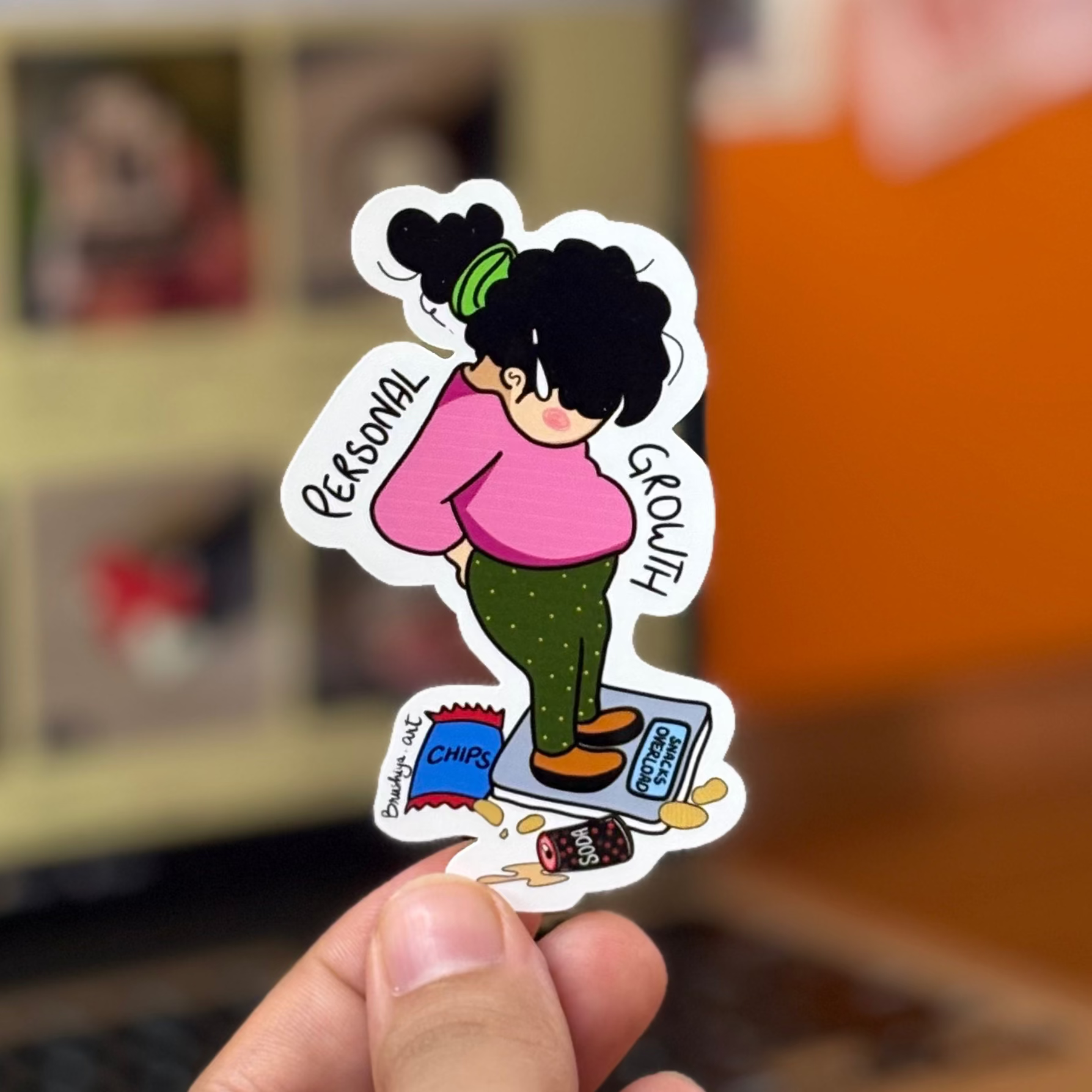 Celebrate the ups and downs of life with this playful "Personal Growth" sticker! Featuring a quirky lady standing on a weighing scale as she embraces a little extra weight, it's a fun reminder that growth comes in all shapes. Perfect for adding humor and a light-hearted touch to your laptop, notebook, or water bottle. Embrace your journey with a smile!