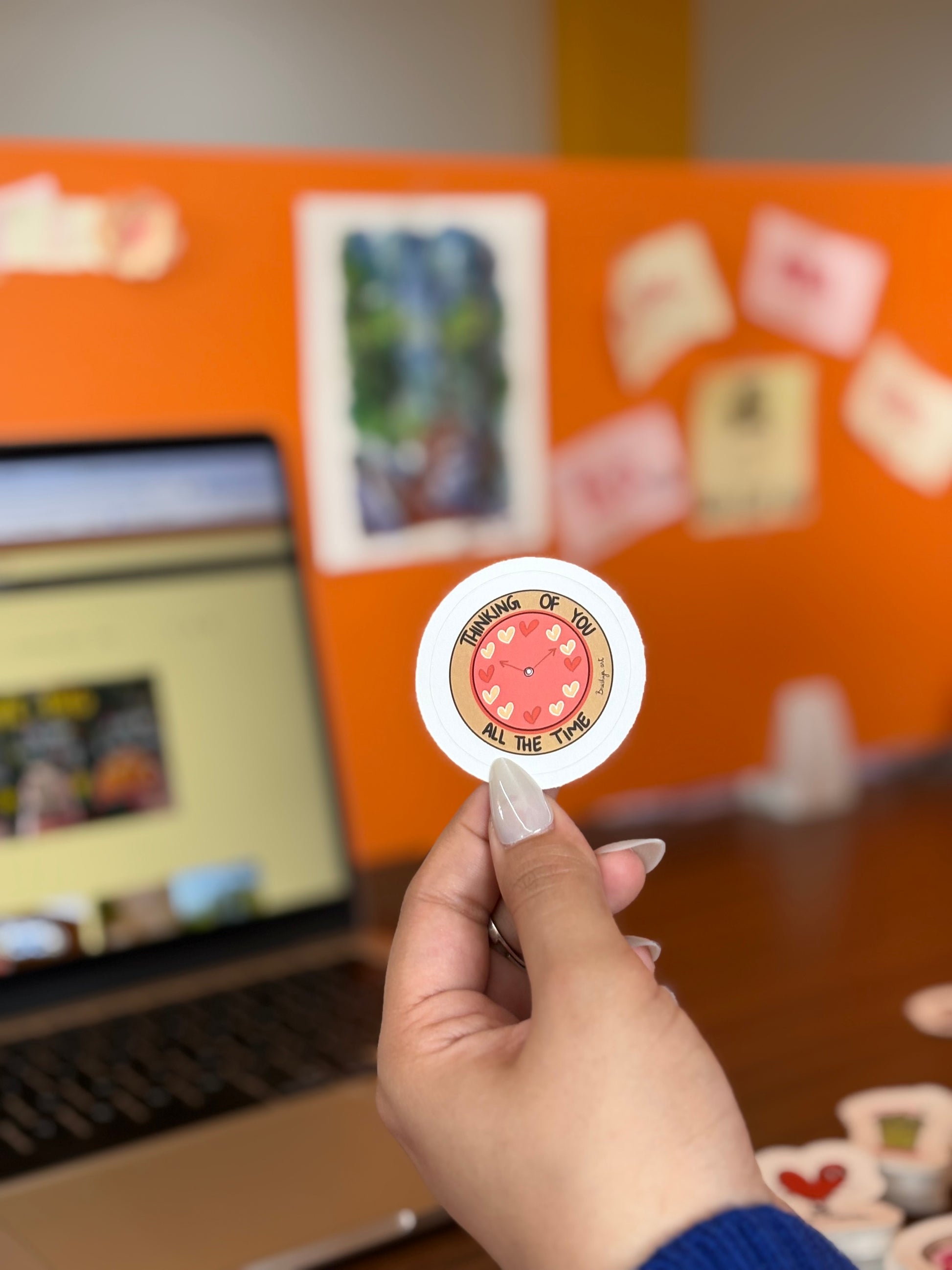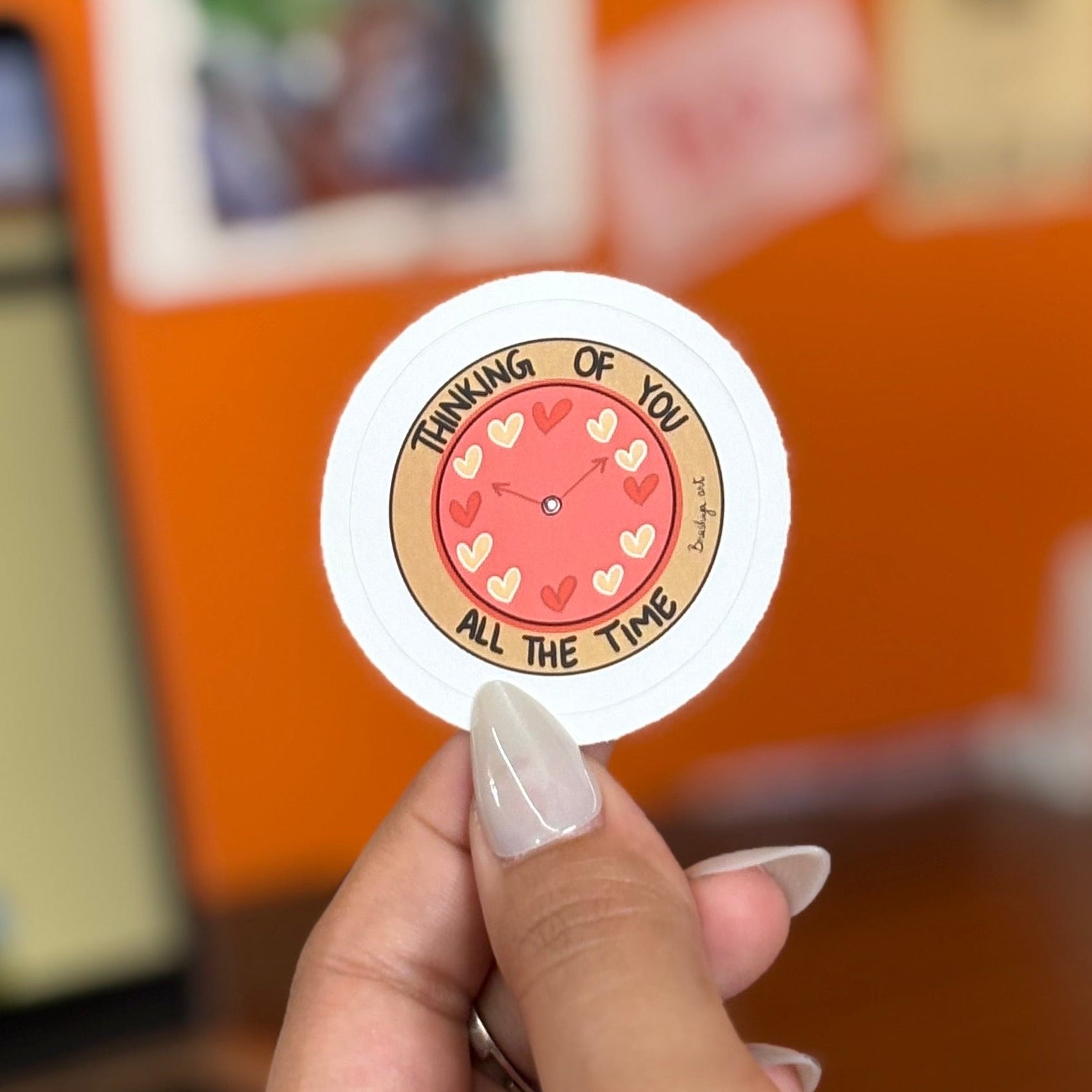 Tick-tock, you're always on my mind! This charming sticker features a whimsical clock design, perfect for reminding someone special that they're constantly in your thoughts. Whether you're decorating laptops, water bottles, or gift packages, this playful reminder spreads warmth and affection with every glance. A sweet, timeless way to show you care.